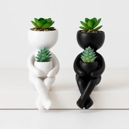 🪴 Diseño doble: cada figura sostiene una maceta frontal y además tiene una segunda maceta en la cabeza.