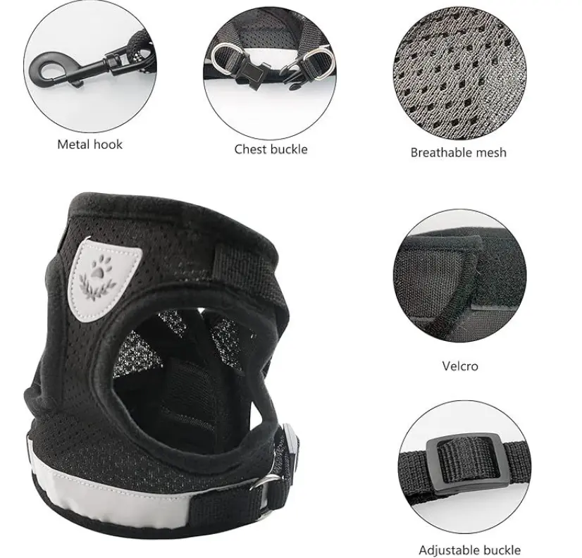 Velcro + hebilla ajustable: permite adaptar el arnés al cuerpo de tu mascota sin lastimarla.